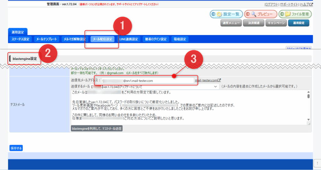 運用設定から①メール配信設定、②blastengine設定内の③送信メールアドレスを開きます。