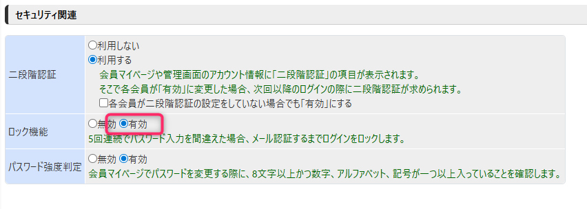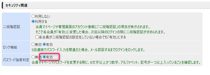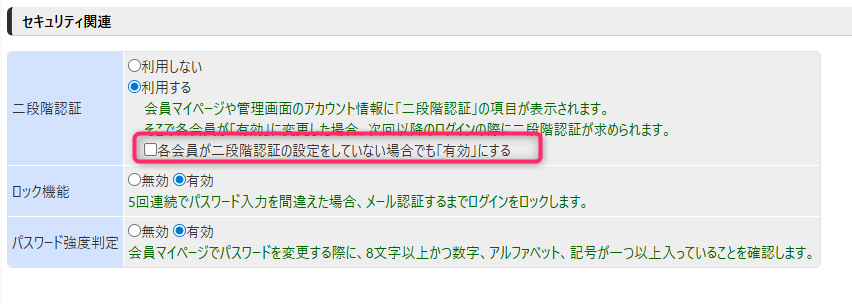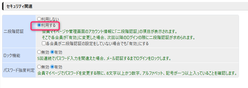 二段階認証「利用する」にした場合でも、各会員が何も設定しない場合、初期値は「無効」になっていますが、このチェックを入れると初期値で有効になります。